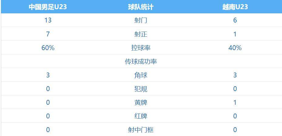 国足U23的控球率为六成,一共有13次射门,其中7次射正;而越南U23一共有6次射门,其中仅有1次射正。返回搜狐,查看更多