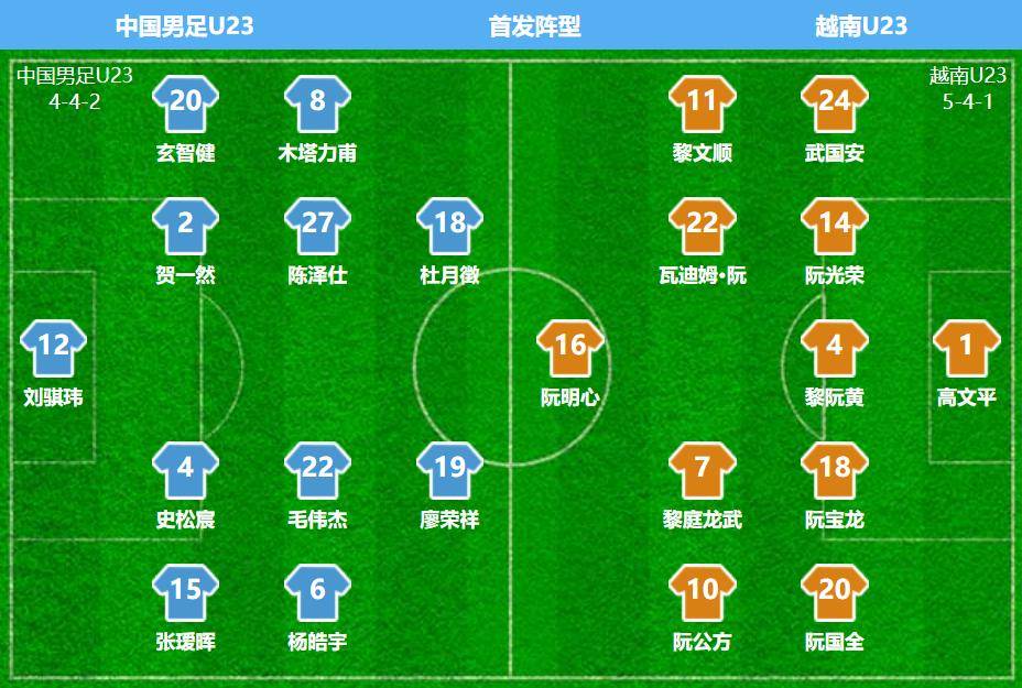 U23国足首发:12-刘骐玮、2-贺一然、4-史松宸、15-张瑷晖、20-玄智健、6-杨皓宇、8-木塔力甫、22-毛伟杰、27-陈泽仕、18-杜月徵、19-廖荣祥