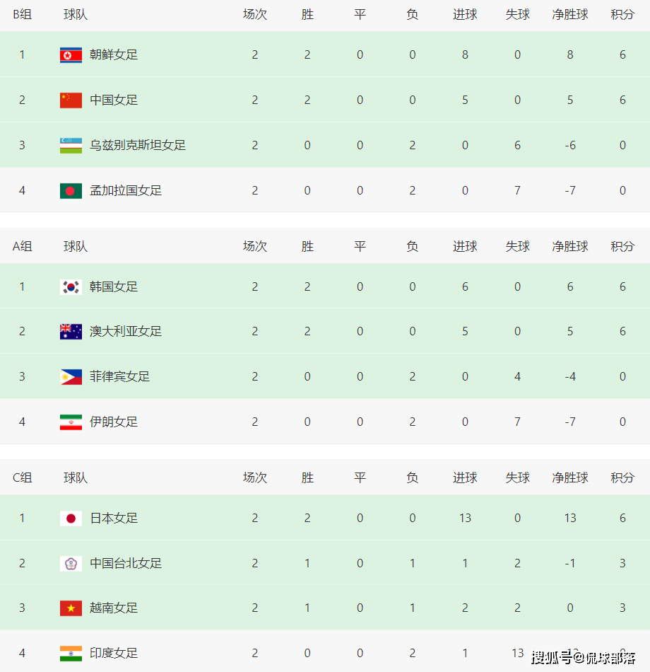 首轮比赛,日本女足2-0战胜中国台北女足,全队还没有找到最佳状态,直到第二轮火力全开,上半场打进五球,下半场再进六球,最终11-0狂胜印度女足。