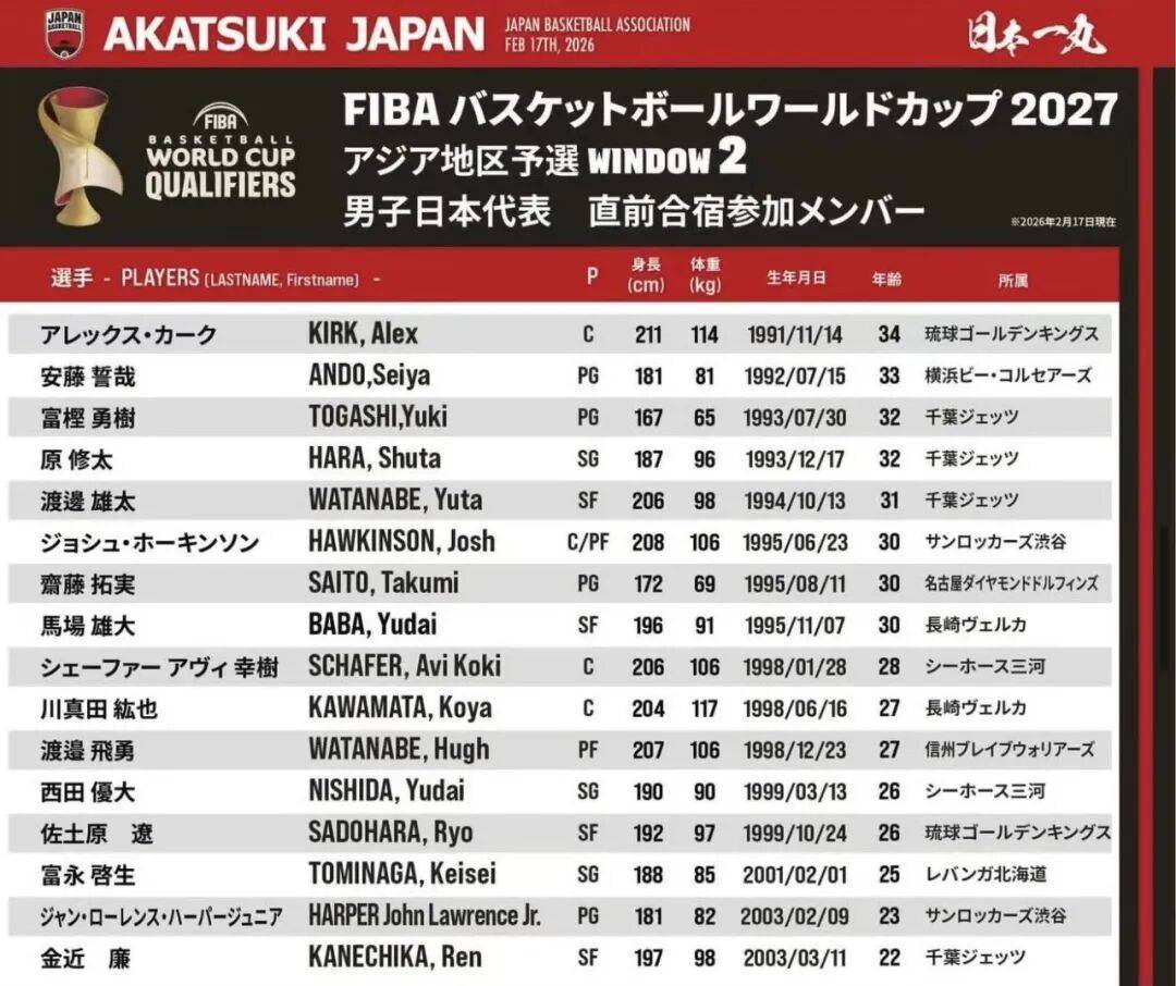 北京时间2月18日,最新消息源报道,日本男篮已经提前九天抵达了第二窗口期比赛的举办地冲绳,他们将在2月26日和3月1日分别对阵中国男篮和韩国男篮。据了解,日本男篮公布的世预赛大名单一共有16人,入选的人员有霍金森、柯克、小约翰逊-哈珀、原修太、渡边勇、金近廉、川真田纮也、幸树、富坚勇树、齐藤拓実、富永启生、佐木原辽、马场雄大、安藤誓哉、西田优大和渡边雄太。