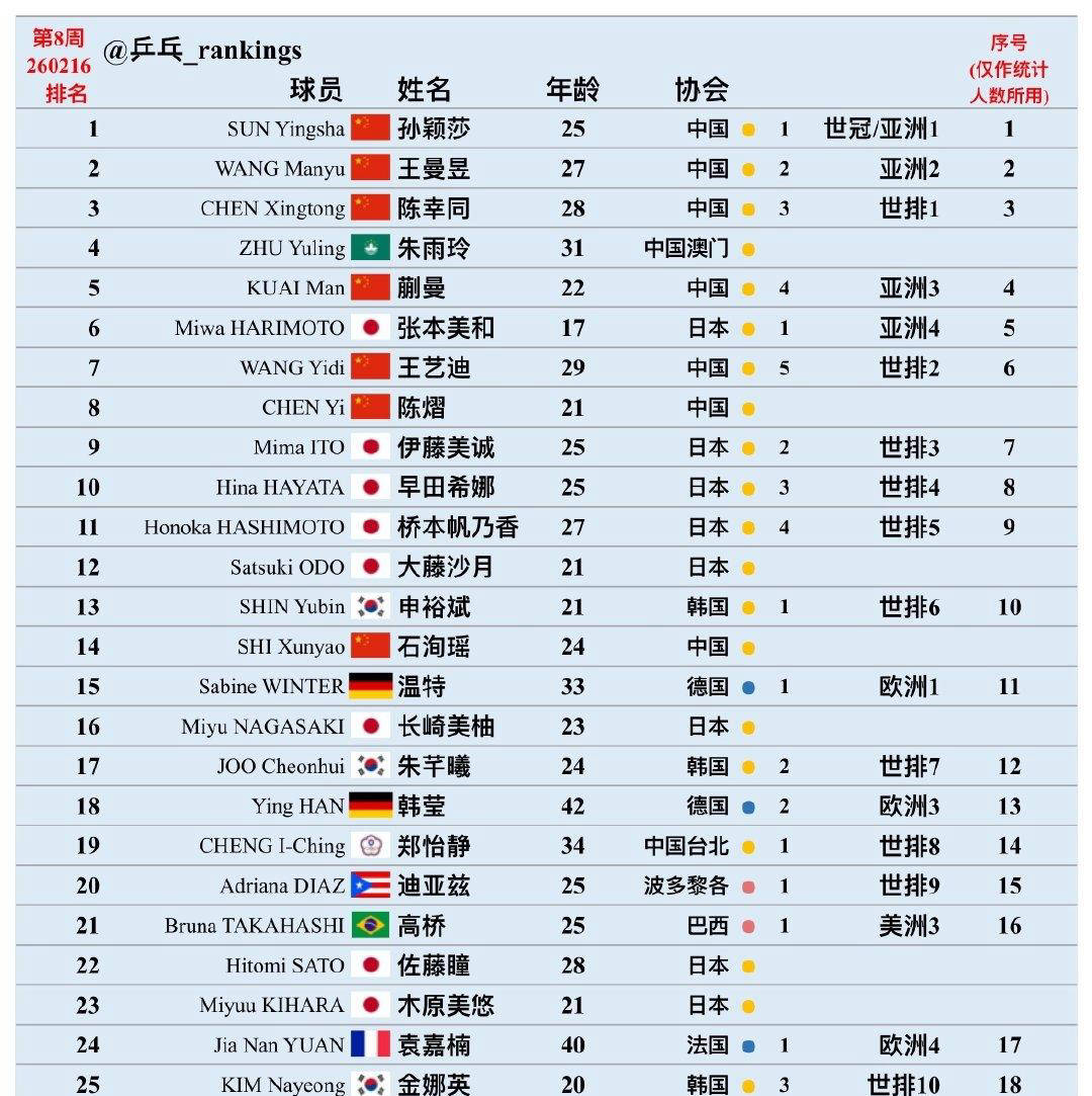 女子方面,孙颖莎因世乒赛与亚洲杯双冠军身份稳居首位,王曼昱、蒯曼和日本选手张本美和均凭亚洲杯四强成绩入围。陈幸同、王艺迪,以及日本的伊藤美诚、早田希娜、桥本帆乃香,还有韩国的申裕斌通过世界排名获得参赛权。德国选手温特凭欧洲十六强杯冠军身份获邀参赛;韩莹、袁嘉楠和匈牙利选手斯佐科斯同样因在欧洲十六强杯进四强获得资格。非洲杯女单冠军高达、世青赛冠军覃予萱也分别拿到了晋级世界杯的门票。大洋洲代表池旼亨和李春丽则因优异表现列入参赛名单。总体来看,除了部分选手通过洲际赛打开参赛之门,大多数参赛者依赖稳定且较高的世界排名确保资格。