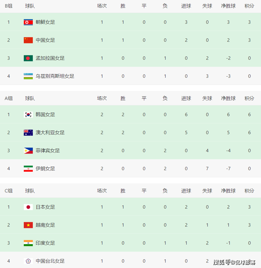 A组最新积分榜:韩国女足、澳大利亚女足同积6分,因净胜球不同分列前二;菲律宾女足、伊朗女足同积0分,因净胜球不同,分列第三、垫底。