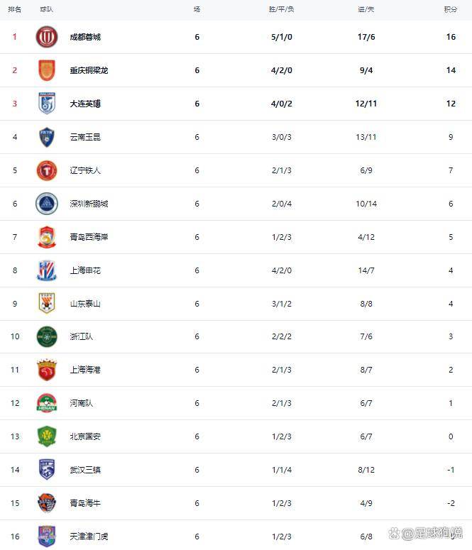 随着第六轮比赛的结束,中超联赛的积分榜也发生了新的变化。成都蓉城以16分的积分高居榜首,他们在本赛季取得了五胜一平的骄人战绩。重庆铜梁龙作为本赛季的一匹黑马,以四胜两平的战绩积14分,排名第二。大连英博凭借着四连胜的势头,积12分排名第三。云南玉昆积9分排名第四。辽宁铁人虽然输掉了比赛,但仍然以7分排名第五。上海申花在赢下本场比赛后,积分达到了4分,排名上升至第八。山东泰山同样积4分,排名第九。浙江队积3分排名第十。上海海港仅积2分排名第十一。北京国安目前仍然是0分,排名第十三。中超联赛的竞争日趋激烈,各支球队都在为更高的目标而努力拼搏。返回搜狐,查看更多