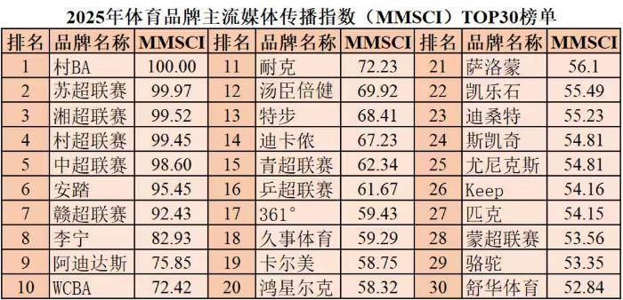 本次发布会正式发布了2025年体育品牌主流媒体传播指数(MMSCI)TOP30榜单,村BA、苏超联赛、湘超联赛、村超联赛、中超联赛、安踏、赣超联赛、李宁、阿迪达斯、WCBA最终进入前十名。