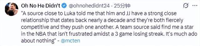 被问及两个人的关系时,麦克米纳明说道:“我跟联盟和球队内部的人士都核实过了,跟你说一下我了解到的情况。一位联盟消息人士说,那段视频一出来,洛杉矶这边就是这样,再小的事都会被无限放大。一位接近东契奇的消息人士告诉我,东契奇和雷迪克关系非常好、非常亲近,这份交情已经快十年了。两人都极度好胜,会互相鞭策、互相推动对方。”