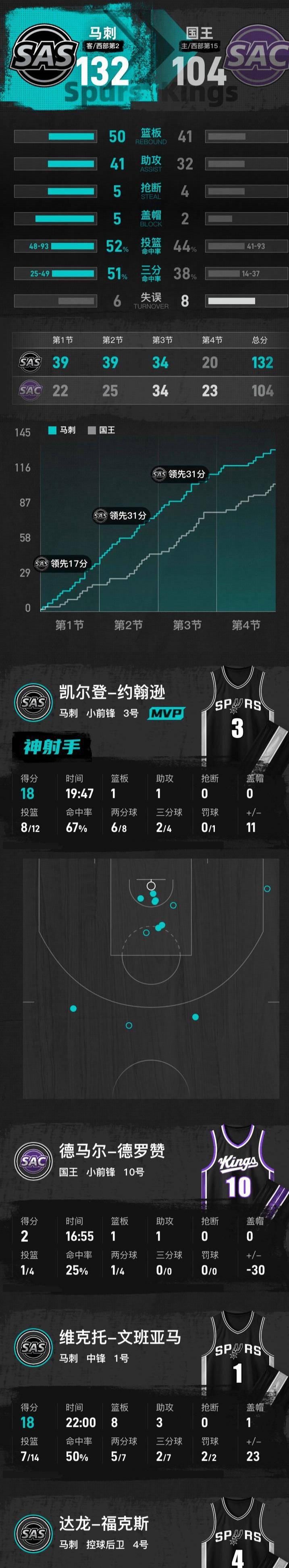 数据统计表上,马刺的投篮命中率、三分命中率、助攻数、篮板数全面占优。他们快攻得分拿了20分,内线分。最大领先分数达到了38分。 国王在各项数据上都被压制了。